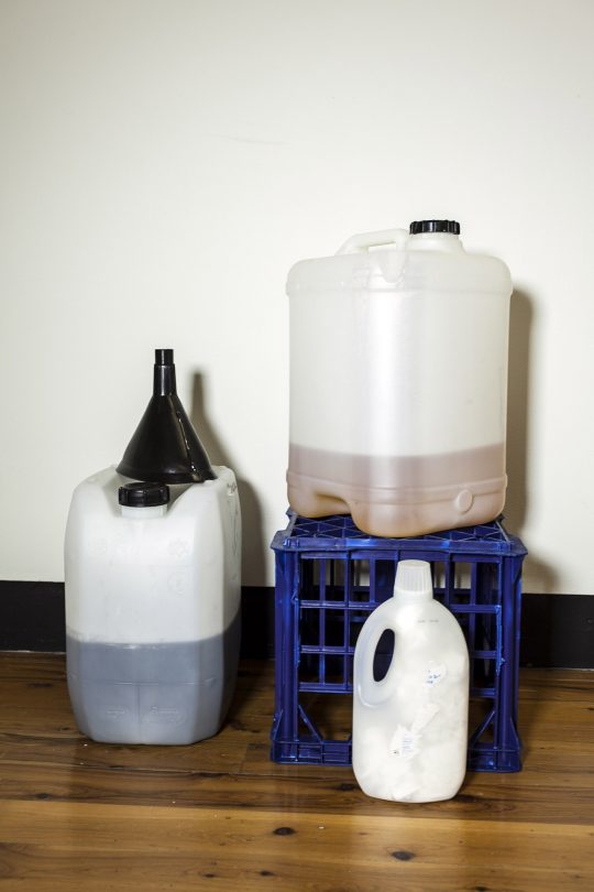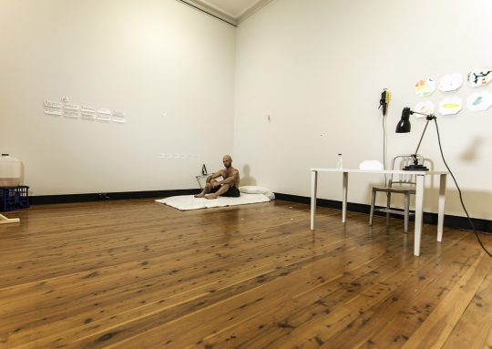 I inhabited the area behind the painting for the entire ten days. I abstained from food for the duration of the work so I could remain “in” the painting and only consumed liquids during the performance. I collected my urine in sealed plastic containers. I had only the single daily contact to communicate my wellbeing during the performance. I had a mattress, blanket and pillow, telephone, paper and art materials. I made a series of small watercolour paintings during the performance.