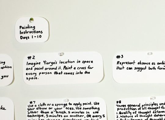 For each of the ten days, once a day a painter executed a set of given instructions for the creation of a painting. Randomly created written instructions were sent via sms the day before each painting action. The painter was responsible for sourcing the paint and brushes with suggestions made to use low cost or no cost sources e.g. donated house paint or unwanted paint from hardware stores.