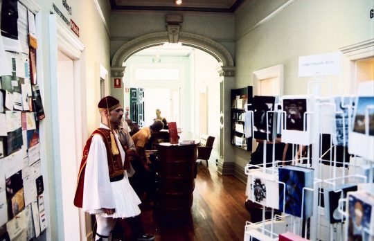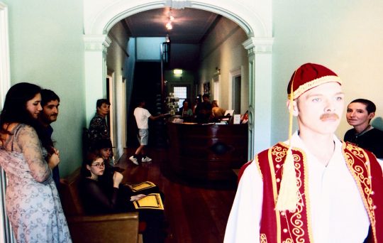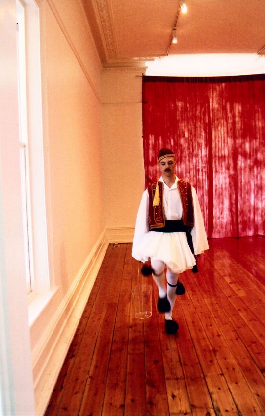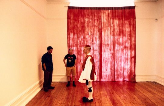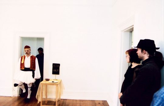 Drawing from my cultural heritage I am dressed in the Greek national Evzone costume. It is a military uniform and I begin with a specific ceremonial march. I ensue with the some dialogue, I smash a plate and eat a dolma with a pair of chopsticks. Then I begin with a progressively audible command to the audience to get OUT.